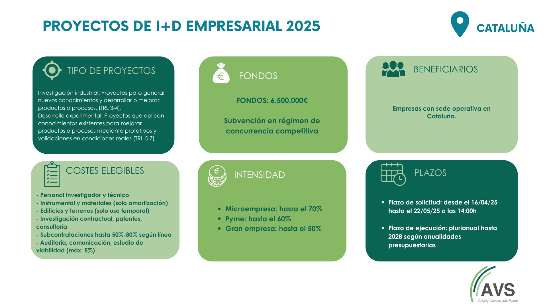 La convocatoria de Subvenciones a Proyectos de I+D Empresarial en Cataluña tiene como objetivo impulsar la competitividad, sostenibilidad y transformación del tejido industrial catalán mediante el fomento de proyectos de investigación industrial y desarrollo experimental. Esta línea de ayudas, promovida por ACCIÓ, cuenta con un presupuesto de 6,5 millones de euros y se concede en régimen de concurrencia competitiva.v